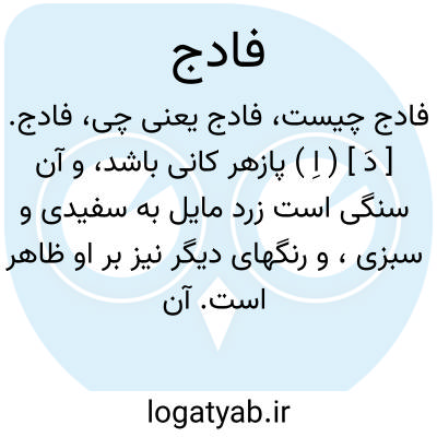 فادج. [ دَ ] ( اِ ) پازهر کانی باشد، و آن سنگی است زرد مایل به سفیدی و سبزی، و رنگهای دیگر نیز بر او ظاهر است. آن را از چین آورند و چون با زردچوبه بر سنگ بسایند سبز پسته ای برآید. گویند پازهر همه زهرهاست، خصوصاً وقتی که طلا کنند، و شربت آن دوازده جو باشد با آب سرد. ( برهان ). در کرمان نیز هست. ( ناظم الاطباء ).