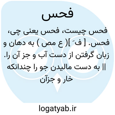 فحس. [ ف َ ]( ع مص ) به دهان و زبان گرفتن از دست آب و جز آن را. || به دست مالیدن جو را چندانکه خار و جزآن از وی دور گردد. ( منتهی الارب ) ( اقرب الموارد ).