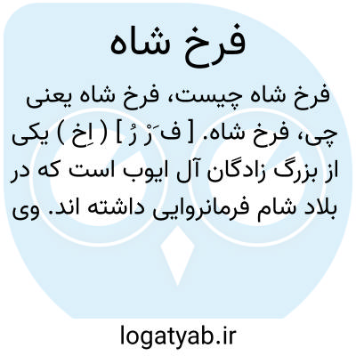 فرخ شاه. [ ف َرْ رُ ] ( اِخ ) یکی از بزرگ زادگان آل ایوب است که در بلاد شام فرمانروایی داشته اند. وی برادرزاده صلاح الدین یوسف بن نجم الدین ایوب است که از طرف صلاح الدین به حکمرانی دمشق منصوب شده بود و مهمترین حادثه تاریخ زندگانی او جنگی است که در حدود سال 570 هَ.ق. میان او و گروهی از مسیحیان اروپا درگرفت و وی در آن جنگ رشادتی به خرج داد و «سپهبد لشکر کفار را از پشت زین بر روی زمین انداخت ». ( از تاریخ حبیب السیر چ سنگی تهران ج 1 ص 406 ).، فرخشاه. [ ف َرْ رُ ] ( اِخ ) یکی از امرای سیستان در زمان سلجوقیان است. وی دو بار، یکی در سال 490 هَ.ق. و دیگر در 501 هَ.ق. به حکومت سیستان رسیده است. ( از تاریخ سیستان چ بهار ص 389 و 391 ).
