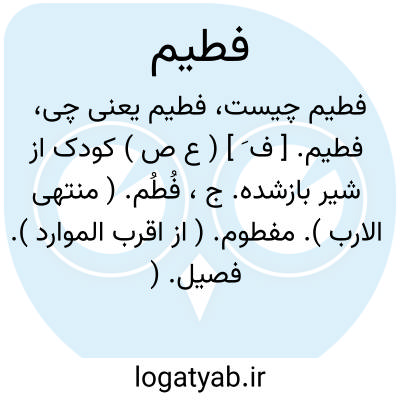 فطیم. [ ف َ ] ( ع ص ) کودک از شیر بازشده. ج، فُطُم. ( منتهی الارب ). مفطوم. ( از اقرب الموارد ). فصیل. ( یادداشت مؤلف ).