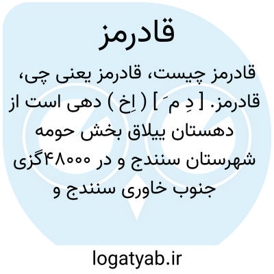 قادرمز. [ دِ م َ ] ( اِخ ) دهی است از دهستان ییلاق بخش حومه شهرستان سنندج و در 48000گزی جنوب خاوری سنندج و 5000گزی جنوب باختر باشماق و در جلگه واقع و هوای آن سردسیری است. 350 تن سکنه دارد. آب آن از چشمه ومحصولات آن غلات و توتون و شغل اهالی زراعت و گله داری است راه مالرو دارد. ( فرهنگ جغرافیائی ایران ج 5 ).