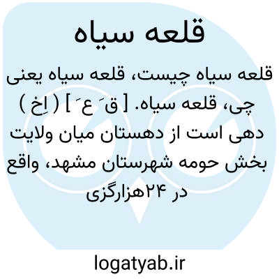 قلعه سیاه. [ ق َ ع َ ] ( اِخ ) دهی است از دهستان میان ولایت بخش حومه شهرستان مشهد، واقع در 24هزارگزی شمال باختری مشهد و کنار راه مشهد به قوچان، موقع جغرافیایی آن جلگه و معتدل است. سکنه آن 223 تن است. آب آن از قنات و محصول آن غلات، و شغل اهالی زراعت و مالداری است.راه مالرو دارد. ( از فرهنگ جغرافیایی ایران ج 9 ).، قلعه سیاه. [ ق َ ع َ ی ِ ] ( اِخ ) این قلعه در دوفرسنگی شمال فهلیان واقع و یک چشمه آب دارد. ( جغرافیای غرب ایران ص 130 ).