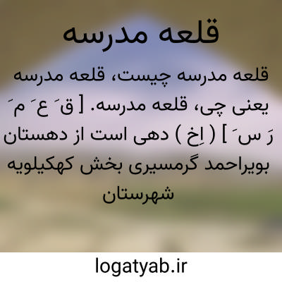 قلعه مدرسه. [ ق َ ع َ م َ رَ س َ ] ( اِخ ) دهی است از دهستان بویراحمد گرمسیری بخش کهکیلویه شهرستان بهبهان، واقع در 2 هزارگزی شمال شوسه آرو به بهبهان. موقع جغرافیایی آن جلگه و هوای آن گرمسیری مالاریائی است. سکنه آن 415 تن است. آب آن از رود خیرآبادو محصول آن غلات، پشم، لبنیات و شغل اهالی زراعت و حشم داری و صنایع دستی زنان گلیم بافی و قالیچه و جوال بافی است. راه مالرو دارد. ساکنین از طایفه بویراحمد گرمسیری هستند. ( از فرهنگ جغرافیایی ایران ج 6 ).
