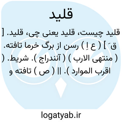 قلید. [ ق َ ] ( ع اِ ) رسن از برگ خرما تافته. ( منتهی الارب ) ( آنندراج ). شریط. ( اقرب الموارد ). || ( ص ) تافته و مفتول. حبل ٌ قلید؛ ای مفتول. ( اقرب الموارد ).