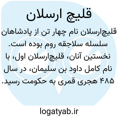 قلیچ ارسلان. [ ق َ اَ س َ ] ( اِخ ) نام چهارتن از سلاجقه روم: 1- قلیچ ارسلان داودبن سلیمان ( قلیچ ارسلان اول ) وی بسال 485 هَ. ق. به حکومت رسید. 2- عزالدین قلیچ ارسلان بن مسعود ( قلیچ ارسلان ثانی ). وی بسال 551 بحکومت رسید و تا سال 588 حیات داشت ولی ممالک خود را چند سال قبل از مرگ بین پسران خود تقسیم کرد. 3- قلیچ ارسلان بن سلیمانشاه ( قلیچ ارسلان سوم ). وی به سال 600 هَ. ق. زمام حکومت را به دست گرفت. 4- رکن الدین قلیچ ارسلان ( چهارم ) که به سال 655 حکومت یافت. وی به سال 663 به قتل رسید. ( معجم الانساب زامباور ).