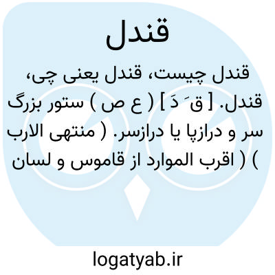 قندل. [ ق ُ ن َ دِ ] ( ع ص ) ستور بزرگ سر و درازپا یا درازسر. ( اقرب الموارد )( منتهی الارب ) ( ناظم الاطباء ). رجوع به قَندِل شود.