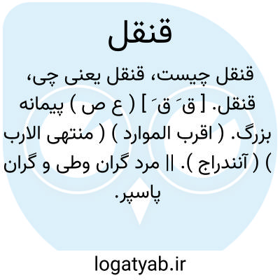 قنقل. [ ق َ ق َ ] ( ع ص ) پیمانه بزرگ. ( اقرب الموارد ) ( منتهی الارب ) ( آنندراج ). || مرد گران وطی و گران پاسپر. ( منتهی الارب )( آنندراج ). الرجل الثقیل الوطاء. ( اقرب الموارد ).