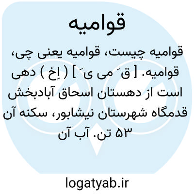 قوامیه. [ ق َ می ی َ ] ( اِخ ) دهی است از دهستان اسحاق آبادبخش قدمگاه شهرستان نیشابور، سکنه آن 53 تن. آب آن از قنات. محصول آن غلات و شغل اهالی آنجا زراعت است.راه مالرو دارد. ( از فرهنگ جغرافیایی ایران ج 9 ).