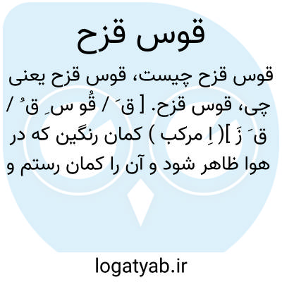 کمان رنگین که در هوا ظاهر شود و آنرا کمان رستم و کمان شیطان گویند و آنرا قوس قزح برای این گویند که قزح ماخوذ است از قزحه بضم یعنی راه سرخ و سبز و زرد یا آنکه بلند است ماخوذ از قزح بمعنی ارتفاع یا منسوب است بملک موکل ابر یا منسوب است بپادشاهی از پادشاهان عجم.