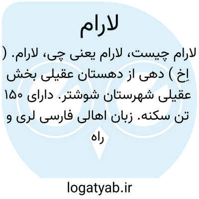 لارام. ( اِخ ) دهی از دهستان عقیلی بخش عقیلی شهرستان شوشتر. دارای 150 تن سکنه. زبان اهالی فارسی لری و راه آنجا مال رو است. آن را پاگچ نیز گویند. ( فرهنگ جغرافیایی ایران ج 6 ).