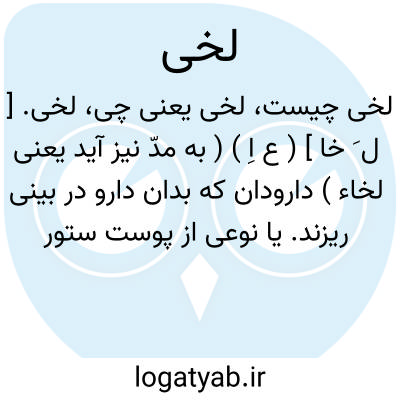 لخی. [ ل َ خا ] ( ع اِ ) ( به مدّ نیز آید یعنی لخاء ) دارودان که بدان دارو در بینی ریزند. یا نوعی از پوست ستور دریایی که بدان دارو در بینی ریزند. || ( ص ) شرم آبناک فراخ. ( منتهی الارب ).