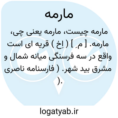 مارمه. [ م ِ ] ( اِخ ) قریه ای است واقع در سه فرسنگی میانه شمال و مشرق بید شهر. ( فارسنامه ناصری ). دهی از دهستان بنارویه است که در بخش جویم شهرستان لار واقع است و 327 تن سکنه دارد. ( از فرهنگ جغرافیایی ایران ج 7 ).