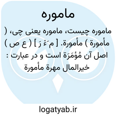 ( مأمورة ) مأمورة. [ م َءْ رَ ] ( ع ص ) اصل آن مُؤمَرَة است و در عبارت: خیرالمال مهرة مأمورة وسکة مأبورة، یعنی بهترین مال، کره ماده است که برکت یافته باشد در نسل و اولاد، برای تبعیت مأبورة؛ مأمورة خوانند و یا بر اصل خود از نصر که لغت غیرفصیح است. ( از منتهی الارب ). مأمورة در عبارت مهرة مأمورة و سکة مأبورة، برای رعایت ازدواج است و اصل، مُؤمَرَة است به معنی بسیار نسل و نتاج. ( از اقرب الموارد ). خیرالمال مهرة مأمورة اوسکة مابورة؛ بهترین مال کره ماده است که برکت یافته باشد در نسل و اولادیا راسته خرمابنان گشن داده شده. ( ناظم الاطباء ).