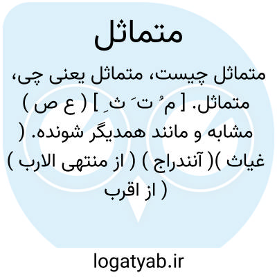 متماثل. [ م ُ ت َ ث ِ ] ( ع ص ) مشابه و مانند همدیگر شونده. ( غیاث )( آنندراج ) ( از منتهی الارب ) ( از اقرب الموارد ). همسرو مانند هم و مثل هم. ( ناظم الاطباء ). || بیماری که به به شدن نزدیک شود. ( آنندراج ). بیمار به شده. ( ناظم الاطباء ) ( از منتهی الارب ) ( از اقرب الموارد ). رجوع به تماثل شود. || در حساب هر دوعدد که متساوی یکدیگر باشند متماثلان خوانند چون چهار و چهار. ( از نفایس الفنون ). دو عددی که هم از لحاظقدر مطلق و هم از لحاظ علامت مانند هم باشند چون «8 و 8» و «5 و 5» متماثلان باشند. رجوع به تماثل شود.