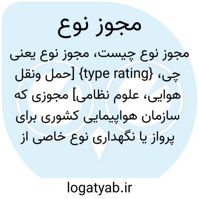 {type rating} [حمل ونقل هوایی، علوم نظامی] مجوزی که سازمان هواپیمایی کشوری برای پرواز یا نگهداری نوع خاصی از هواگرد با وزن بیشینۀ برخاست بالاتر از 5670 کیلوگرم صادر می کند