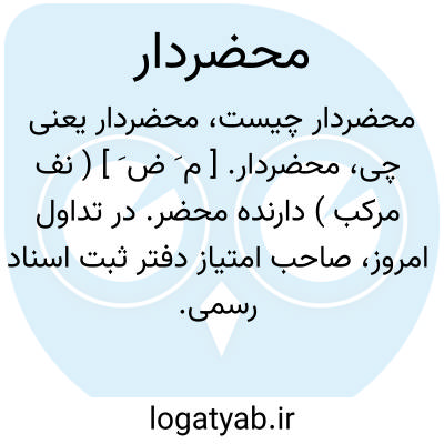 محضردار. [ م َ ض َ ] ( نف مرکب ) دارنده محضر. در تداول امروز، صاحب امتیاز دفتر ثبت اسناد رسمی. سردفتر. کسی که برحسب موازین قانونی مسئول دفتر اسناد رسمی یا دفتر ازدواج و طلاق است.