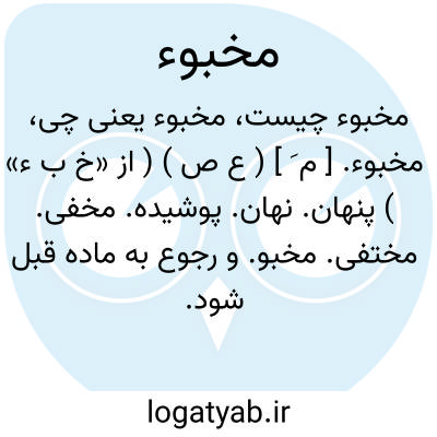 مخبوء. [ م َ ] ( ع ص ) ( از «خ ب ء» ) پنهان. نهان. پوشیده. مخفی. مختفی. مخبو. و رجوع به ماده قبل شود.