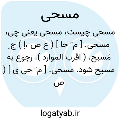 ( اسم ) نوعی از موزه که صلحا و امرا در پا میکردند ( غیاث ): مسحی در پای ور کوه در دست از دور سلام کرد و بنشست. ( اوحدی ) غیر نعلین و گیوه و موزه غیر مسحی و کفش و پای اوزار. ( نظام قاری.۲۳ ) توضیح بعضی در ین بیت گلستان: دلقت بچه کار آید و مسحی و مرقع خود را ز عملهای نکوهیده بری دار. یائ نسبت یعنی جام. زبر و خشن که از موی بز خر و شتر میبافتند و صوفیه بتن میکردند.