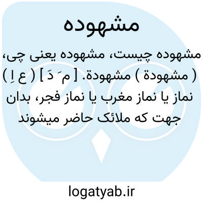 ( مشهودة ) مشهودة. [ م َ دَ ] ( ع اِ ) نماز یا نماز مغرب یا نماز فجر، بدان جهت که ملائک حاضر میشوند و مزد مصلی را مینویسند، یاملائک شب و ملائک روز حاضر میشوند آن را. ( منتهی الارب ). نماز یا نماز مغرب یا نماز فجر. ( ناظم الاطباء ).