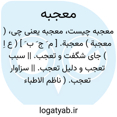 ( معجبة ) معجبة. [ م َ ج َ ب َ ] ( ع اِ ) جای شگفت و تعجب. || سبب تعجب و دلیل تعجب. || سزاوار تعجب. ( ناظم الاطباء ) ( از فرهنگ جانسون ).