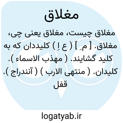 مغلاق. [ م ِ ] ( ع اِ ) کلیددان که به کلید گشایند. ( مهذب الاسماء ). کلیدان. ( منتهی الارب ) ( آنندراج ). قفل و قلاب که بدان در رابندند. ( غیاث ). کلیددان و هر چیز که بدان در را محکم کنند. ( ناظم الاطباء ). آنچه بدان در را بندند و به وسیله کلید گشایند. ج، مغالیق. ( از اقرب الموارد ).