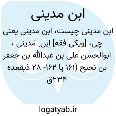 [ویکی فقه] اِبْن ِ مَدینی، ابوالحسن علی بن عبدالله بن جعفر بن نجیح (۱۶۱ یا ۱۶۲- ۲۸ ذیقعده ۲۳۴ق /۷۷۸ یا ۷۷۹-۲۳ ژوئن ۸۴۹م )، از پیشروان علوم حدیث در بغداد بود.