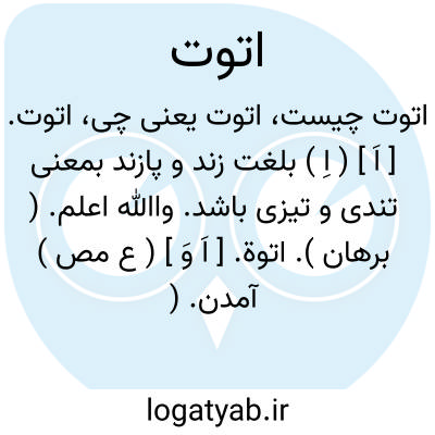 اتوت. [ اَ ] ( اِ ) بلغت زند و پازند بمعنی تندی و تیزی باشد. واﷲ اعلم. ( برهان ).
