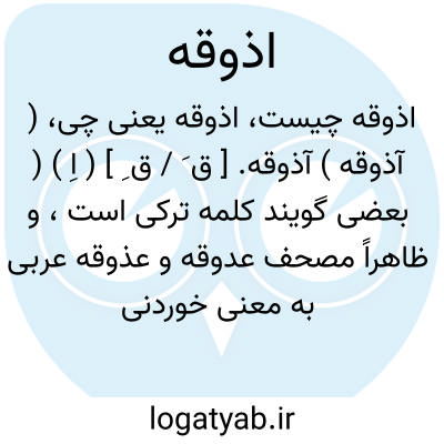 ( آذوقه ) ( اسم ) ۱- غذایی که در سفر با خود دارند توشه. ۲ - آنچهدر خانه از غله و حبوب و مانند آن جمع کنند برای مصرف چند ماه یا یک سال. معمولا این کلمه را بصورت ( آذوقه ) نویسند.