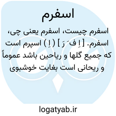 اسفرم. [ اِ ف َ رَ ] ( اِ ) اسپرم است که جمیع گلها و ریاحین باشد عموماً و ریحانی است بغایت خوشبوی که آنرا آس نیز گویند خصوصاً. ( برهان ). اسپرم. اسپرغم. اسفرغم.ریحان. برگهای معطر چون ریحان و امثال آن. هر گیاه و ثمر و گل خوشبوی. صاحب ذخیره خوارزمشاهی برای اسفرم ها بابی دارد و بیست واند گیاه ذیل را نام می برد: