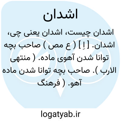 اشدان. [ اِ ] ( ع مص ) صاحب بچه توانا شدن آهوی ماده. ( منتهی الارب ). صاحب بچه توانا شدن ماده آهو. ( فرهنگ خطی ). و در اقرب الموارد آمده است: اشدنت الظبیة؛ شَدَن َ ولدها. و ذیل «شدن » آرد: شَدَن َ الظبی و جمیعُ وَلَد ذوات الظلف و الخف و الحافر شُدوناً؛ قوی و ترعرع و استغنی عن امه. و در فرهنگ خطی این معنی بدین سان آمده است: بزرگ بچه شدن آهوی ماده چنانکه احتیاج به شیر دادن بچه نداشته باشد.