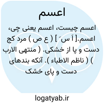 اعسم.[ اَ س َ ] ( ع ص ) مرد کج دست و پا از خشکی. ( منتهی الارب ) ( ناظم الاطباء ). آنکه بندهای دست و پای خشک دارد. ( تاج المصادر بیهقی ). خشک دست. ( مهذب الاسماء نسخه خطی ). آنکه بند دست و پای او خشکیده باشد آنچنانکه کف و قدم و پایش خمیده شده باشد. ( از اقرب الموارد ). بند دست خشک شده باشد. ( مصادر زوزنی ). یقال: «فی یده او قدمه عسم ». ( اقرب الموارد ). مؤنث: عَسماء. ( اقرب الموارد ) ( منتهی الارب ) ( مهذب الاسماء نسخه خطی ).