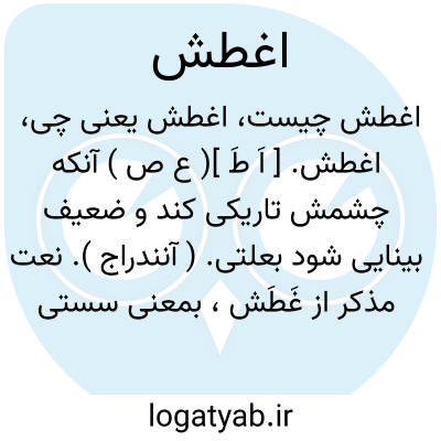 اغطش. [ اَ طَ ]( ع ص ) آنکه چشمش تاریکی کند و ضعیف بینایی شود بعلتی. ( آنندراج ). نعت مذکر از غَطَش، بمعنی سستی بینایی.( منتهی الارب ). روزکور. ( یادداشت بخط مؤلف ). آنکه بد بیند و آب همی ریزد. ( تاج المصادر بیهقی ). تاریک شدن چشم. ( المصادر زوزنی ). آنکه بد بیند و از چشم او آب همی ریزد. مؤنث: غطشاء. ( مهذب الاسماء نسخه خطی ).