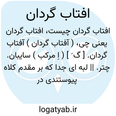 ( آفتاب گردان ) (گَ ) ۱ - (ص فا. ) سایبان، چتر. ۲ - پارچة ضخیم یا لبة کلاه که جلو تابش آفتاب بر چهره را می گیرد. ۳ - (اِمر. ) گیاهی از تیرة مرکبان که تخم آن را تف داده یا روغن گیرند.