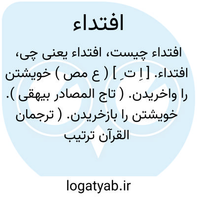 افتداء. [ اِ ت ِ ] ( ع مص ) خویشتن را واخریدن. ( تاج المصادر بیهقی ). خویشتن را بازخریدن. ( ترجمان القرآن ترتیب عادل بن علی ). سر خریدن و سربها دادن.( منتهی الارب ) ( آنندراج ) ( از ناظم الاطباء ). نجات دادن کسی را از اسارت با دادن مالی. ( از اقرب الموارد ).بازخریدن جان. سرخرید دادن. فدیه. فداء دادن. ( یادداشت بخط مؤلف ). || دادن زن مالی را بشوی خود تا رهایی یابد با طلاق گرفتن. ( از اقرب الموارد ).دادن مالی بشوی طلاق را. ( یادداشت مؤلف ). || تحامی کردن و انزوا گزیدن از چیزی. یقال: افتدی منه بکذا؛ تحاماه و انزوی عنه. ( از اقرب الموارد ).