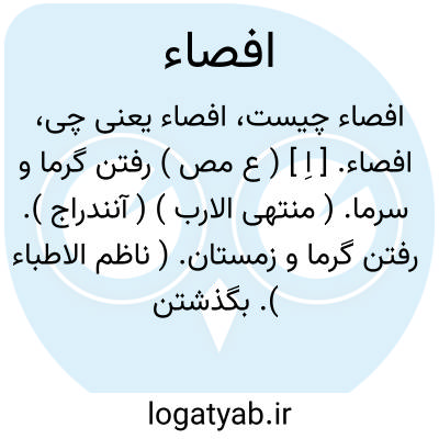 افصاء. [ اِ ] ( ع مص ) رفتن گرما و سرما. ( منتهی الارب ) ( آنندراج ). رفتن گرما و زمستان. ( ناظم الاطباء ). بگذشتن گرما. ( تاج المصادر بیهقی ). || بازایستادن باران. ( منتهی الارب ) ( آنندراج ) ( تاج المصادر بیهقی ) ( ناظم الاطباء ). || درآویخته نشدن شکار در دام صیاد. ( آنندراج ) ( از اقرب الموارد ) ( از متن اللغة ) ( از قطر المحیط ). || رهایی یافتن و خلاص شدن. ( منتهی الارب ) ( ناظم الاطباء ). رستن و رهایی یافتن از چیزی و خلاص شدن. ( آنندراج ).