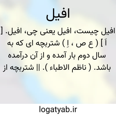 افیل. [ اَ ] ( ع ص، اِ ) شتربچه ای که به سال دوم بار آمده و از آن درآمده باشد. ( ناظم الاطباء ). || شتربچه از مادر جداشده. مؤنث: اَفیلة. ج، اِفال، اَفائِل. ( منتهی الارب ) ( آنندراج ) ( ناظم الاطباء ). شتر خرد. ( مهذب الاسماء نسخه خطی ). شتر جوان. ( شرح نصاب از غیاث اللغات ).
