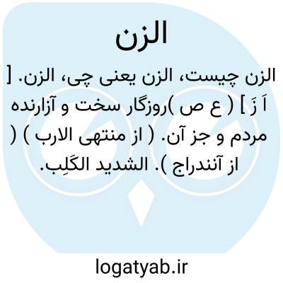 الزن. [ اَ زَ ] ( ع ص )روزگار سخت و آزارنده مردم و جز آن. ( از منتهی الارب ) ( از آنندراج ). الشدید الکَلِب. ( اقرب الموارد ).