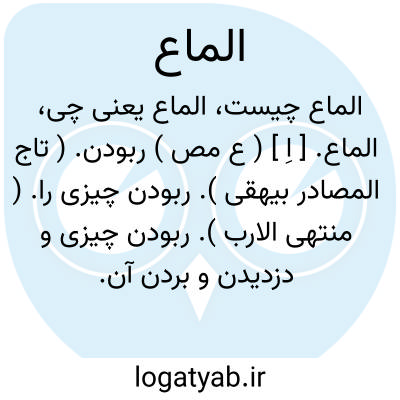 الماع. [ اِ ] ( ع مص ) ربودن. ( تاج المصادر بیهقی ). ربودن چیزی را. ( منتهی الارب ). ربودن چیزی و دزدیدن و بردن آن. ( از اقرب الموارد ). || آبستنی آشکار کردن و پستان کردن مادیان و ماده خر و ماده شتر و ماده اسپ و سرهای پستان سیاه شدن آبستن را. ( منتهی الارب ) ( آنندراج ). درخشیدن پستانهای مادیان و... بسبب بارداری و سیاه شدن سر پستانها. ( از اقرب الموارد ) ( از تاج العروس ). || دنب برداشتن گوسپند تا آبستنی و بارداری وی دریافته شود. ( منتهی الارب ) ( آنندراج ). بلند کردن گوسفند دنب خود را تا حاملگی او معلوم شود، و صفت آن مُلمِع و ملمعة است. ( از اقرب الموارد ). || جنبیدن بچه در شکم ماده. ( منتهی الارب ) ( آنندراج ) ( از اقرب الموارد ). || لمعه برآوردن زمین. ( منتهی الارب ) ( آنندراج ). زمین با سپید گندمه شدن. ( تاج المصادر بیهقی ).لمعه داشتن زمین یا پرگیاه شدن آن، و لُمعه پاره گیاه خشک میان گیاه تر است، و صاحب لسان گوید: الماع اینست که گیاه سال گذشته بگیاه تازه درآمیزد. ( از اقرب الموارد ). || به لباس اشاره کردن بکسی.المع الیه بثوبه؛ اشاره به الیه. ( اقرب الموارد ).