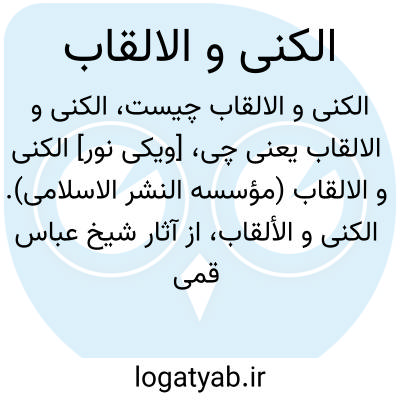 [ویکی شیعه] الکنی و الالقاب (کتاب). اَلْکُنی وَ الْاَلْقاب کتابی به زبان عربی در سه جلد تألیف شیخ عباس قمی (متوفای۱۳۵۹ق). وی در این کتاب، به معرفی علمای مشهور شیعه و سنی و بسیاری از شعرا، ادبا و امرای نامدار پرداخته است. او در خلال معرفی اشخاص به نکات ادبی، اخلاقی، علمی و اشعار و لطایف هم اشاره می کند. این کتاب به زبان فارسی برگردانده شده و پژوهش هایی هم پیرامون آن شده است.