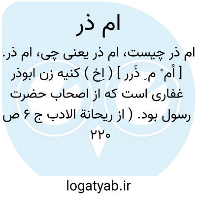 ام ذر. [ اُم ْ م ِ ذَرر ] ( اِخ ) کنیه زن ابوذر غفاری است که از اصحاب حضرت رسول بود. ( از ریحانة الادب ج 6 ص 220 و منتهی الارب ).، امذر. [ اَ ذَ ] ( ع ص ) بسیار شونده بحاجتگاه. ( ناظم الاطباء ) ( از منتهی الارب ). آنکه به مستراح بسیار برود. ( از اقرب الموارد ).