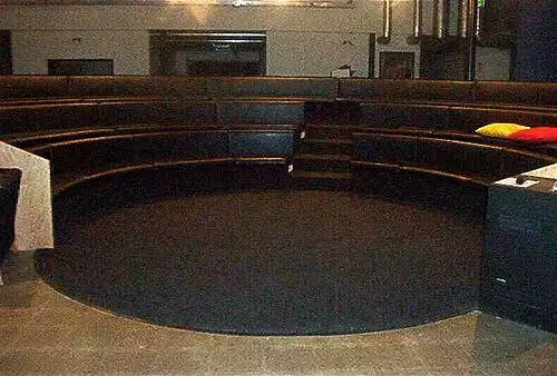 ( آمفی تئاتر ) سالنی به شکل نیم دایره یا بیضی دارای جایگاه های پلکان مانند برای نشستن و صحنه ای در پایین که در آن گردهمایی، تئاتر، حرکات نمایشی و مانند آن ها برگزار می شود.