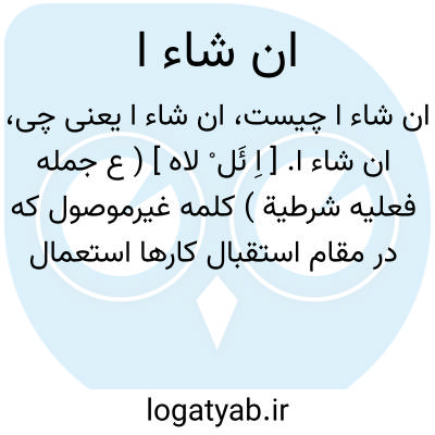 ان شاء ا. [ اِ ئَل ْ لاه ] ( ع جمله فعلیه شرطیة ) کلمه غیرموصول که در مقام استقبال کارها استعمال می کنند؛ یعنی اگر بخواهد خدا. ( ناظم الاطباء ). اگر خدای خواهد. اگر خواهد. بخواست خدا. ( یادداشت مؤلف ):