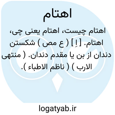 اهتام. [ اِ ] ( ع مص ) شکستن دندان از بن یا مقدم دندان. ( منتهی الارب ) ( ناظم الاطباء ).