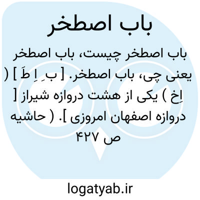 باب اصطخر. [ ب ِ اِ طَ ] ( اِخ ) یکی از هشت دروازه شیراز [ دروازه اصفهان امروزی ]. ( حاشیه ص 427 شدالازار ). مدفن الشیخ ابوعبداﷲ المشهور به علم دار، و شیخ ابوبکر علاف و حسن کیا از سادات قزوین مقیم شیراز. و بنا بروایت عمدةالطالب مدفن علی بن حمزه. ( شدالازار ).