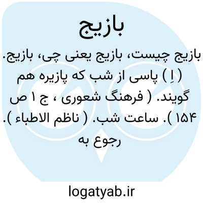 بازیج. ( اِ ) پاسی از شب که پازیره هم گویند. ( فرهنگ شعوری، ج 1 ص 154 ). ساعت شب. ( ناظم الاطباء ). رجوع به بازیره شود. || منجوقی که به گهواره بچه ها می آویزند و آنرا بازپیچ هم گویند. ( فرهنگ شعوری ). هر چیزی که جهت بازی کردن کودک به گهواره آویزان کنند. ( ناظم الاطباء ):