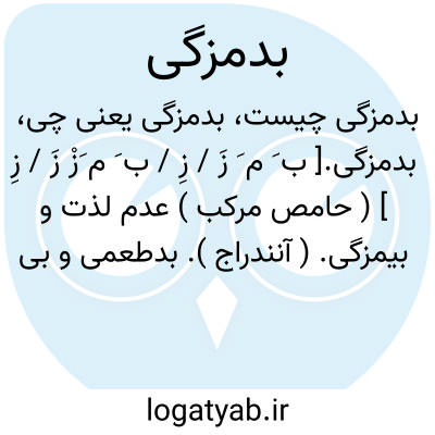 بدمزگی.[ ب َ م َ زَ / زِ / ب َ م َزْ زَ / زِ ] ( حامص مرکب ) عدم لذت و بیمزگی. ( آنندراج ). بدطعمی و بی لذتی. ( ناظم الاطباء ). || ناگوارایی. ( فرهنگ فارسی معین ). || بمجاز، کنایه از سردمهری میان دوستان. ( آنندراج ). برودت میان دوستان. ( ناظم الاطباء ).