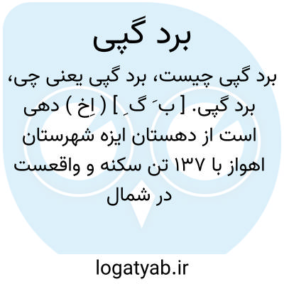 برد گپی. [ ب َ گ ِ ] ( اِخ ) دهی است از دهستان ایزه شهرستان اهواز با 137 تن سکنه و واقعست در شمال ایزه. شغل اهالی زراعت است. ( از فرهنگ جغرافیایی ایران ج 6 ).