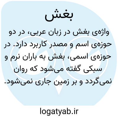 واژهی بَغش در زبان عربی، در دو حوزهی اسم و مصدر کاربرد دارد. در حوزهی اسمی، بَغش به باران نرم و سبکی گفته میشود که روان نمیگردد و بر زمین جاری نمیشود. در متونی مانند منتهی الارب و ناظمالاطباء به این معنا اشاره شده و گاه به صورت بَغشه نیز آورده شده است. همچنین در برخی منابع، ترتیب بارشهای سبک به صورت اول الطل، ثم الرَد، ثم البَغش بیان شده که نشاندهندهی شدت کم بارش در این نوع باران است. به عنوان مصدر، بَغش به معنای باریدن باران نرم و ضعیف است. علاوه بر این، در کاربردهای دیگر، عبارت یَبغِشُ إِلَیه در مورد کودکی به کار میرود که با کسی بازی میکند و نزدیک است به گریه بیفتد. همچنین، این واژه برای توصیف پدیدار شدن ذرات غبار در هوا در برابر نور آفتاب که از روزنی میتابد نیز استفاده میشود؛ چنانکه در عبارت یَبغُشُ الهَباء دیده میشود. این واژه با وجود داشتن معانی متنوع، در متون قدیمی عربی بیشتر در حوزهی توصیف پدیدههای طبیعی و رفتاری به کار رفته و امروزه نیز در متون ادبی و تاریخی قابل مشاهده است.