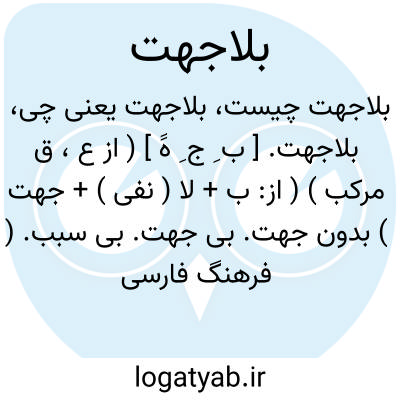 بلاجهت. [ ب ِ ج ِ هََ ] ( از ع، ق مرکب ) ( از: ب + لا ( نفی ) + جهت ) بدون جهت. بی جهت. بی سبب. ( فرهنگ فارسی معین ). بی علت. بی دلیل.