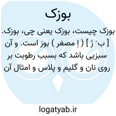 بوزک. [ ب َ زَ ] ( اِ مصغر ) بوز است. و آن سبزیی باشد که بسبب رطوبت بر روی نان و گلیم و پلاس و امثال آن بندد. ( برهان ). بوز. ( آنندراج ). سبزیی یا سپیدیی پنبه مانند، که از هوای سرد بر نان کهنه یا آچار نشیند. ( غیاث ). سبزیی که بر نان و جزآن بواسطه رطوبت و نم نشیند. ( رشیدی ):